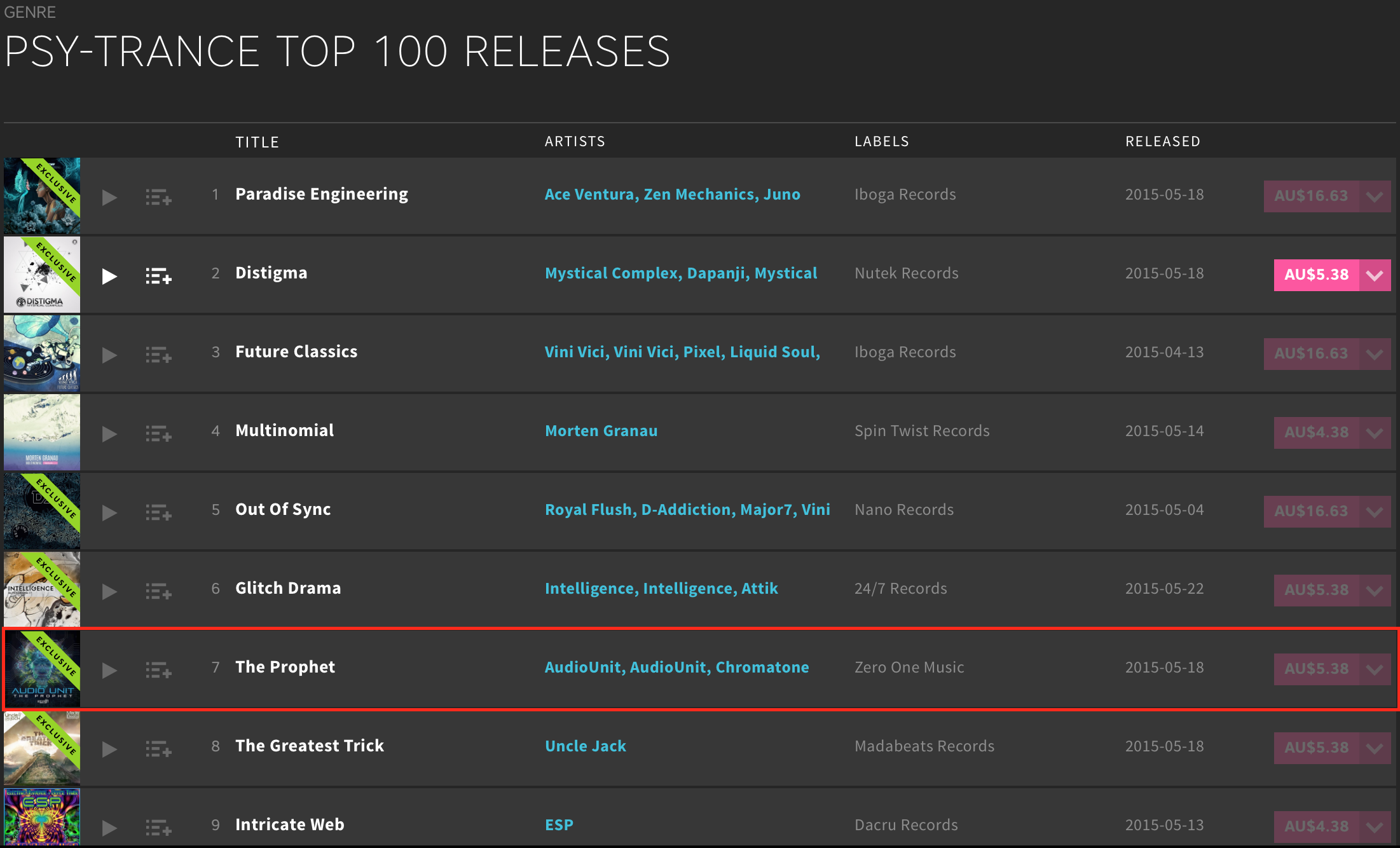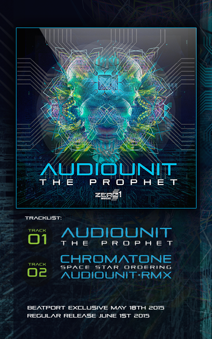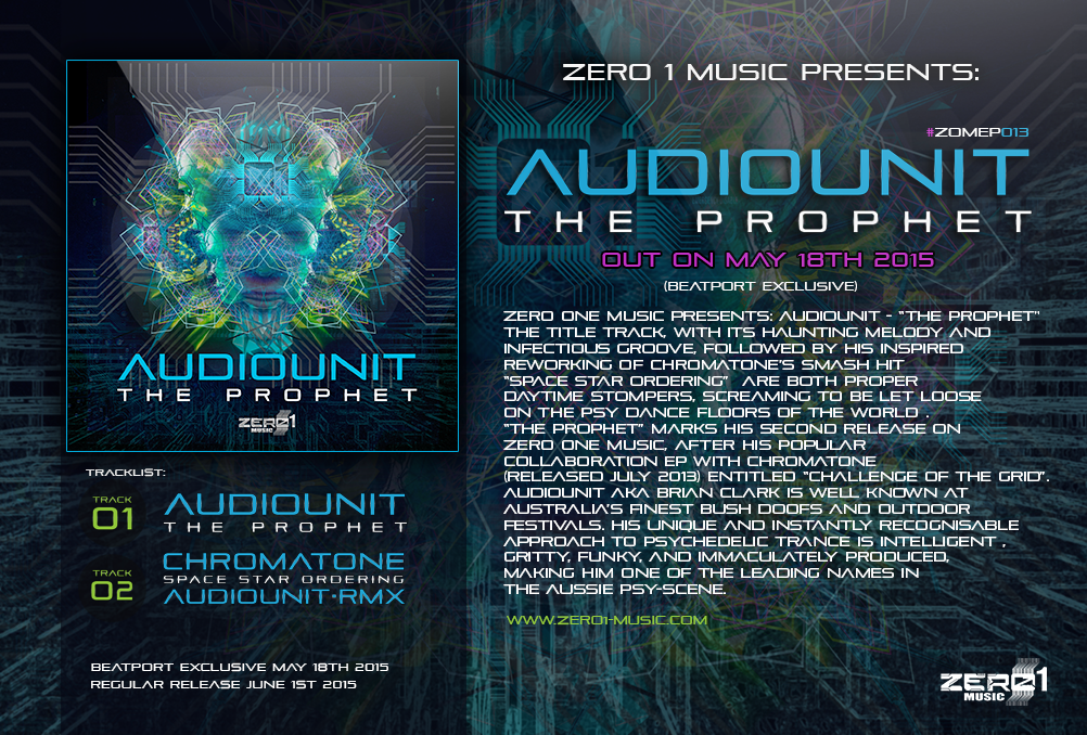 ”The Prophet” marks his second release on Zero One Music, after his extremely popular collaboration EP with Chromatone (released July 2013), entitled: AudioUnit vs Chromatone – “Challenge of the Grid”. The title track of this new solo EP, with its haunting melody and infectious groove, followed by his inspired reworking of Chromatone’s smash hit, “Space Star Ordering” are both proper stompers, screaming to be let loose on the psychedelic dance floors of the world.